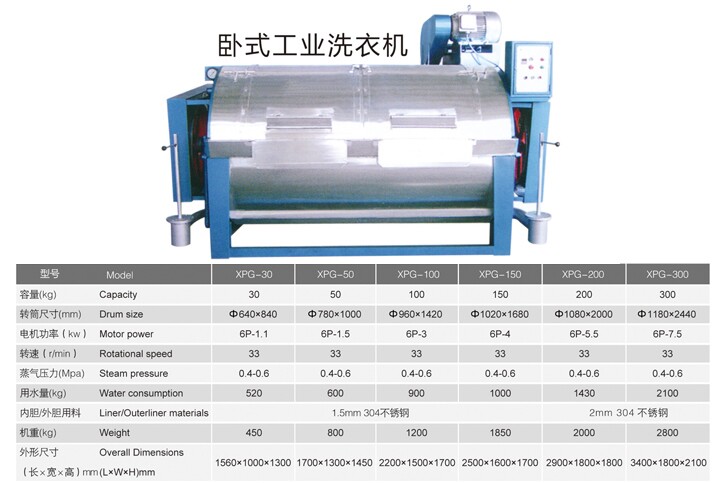 工業洗衣機(全自動工業洗衣機\洗脫兩用機\大型洗衣設備)主要特點: 1. 工業洗衣機內、外殼均采用優質不銹鋼制造,并經拋光處理,不污染損傷衣物; 2. 工業洗衣機自動定時,洗滌容量大,噪音低、震動小; 3. 工業洗衣機工作門設有安全裝置,保證操作安全; 4. 工業洗衣機新一代溫度控制系統,確保漂洗加工效果; 5. 工業洗衣機節省能源,便于操作與保養。