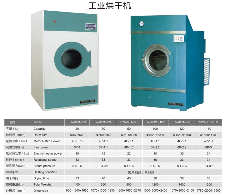 烘干機(烘干機\干衣機\衣物烘干機)主要特點: 1.?烘干機采用自動控制裝置,只需要通過控制面板調節好時間,即可自動完成整個烘干過程; 2.?烘干機轉筒采用優質不銹鋼制作,簡體美觀光滑,經久耐用,絕無劃傷織物現象; 3.?烘干機大門設計,方便門180°自由打開,提取衣物更容易; 4.?烘干機采用三角膠帶傳動,運轉平穩、噪音低、安全可靠