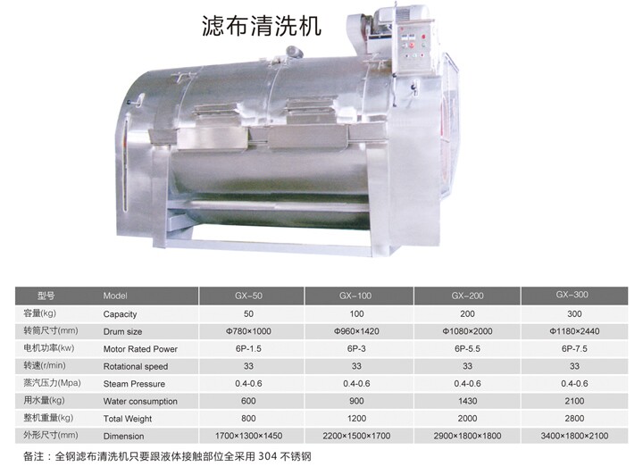 濾布清洗機外形美觀大方,高效節能,運行平穩,滾籠采用不銹鋼制作,抗腐蝕能力強,經久耐用,轉軸兩端采用耐酸、耐堿、耐磨性優良的氟橡膠油封、使軸兩端不易漏,不會磨損、污染濾布。采用微電腦控制,洗滌時間,洗滌溫度根據衣物的具體情況任意設定,使用維修方便,占地面積少,噪音低。